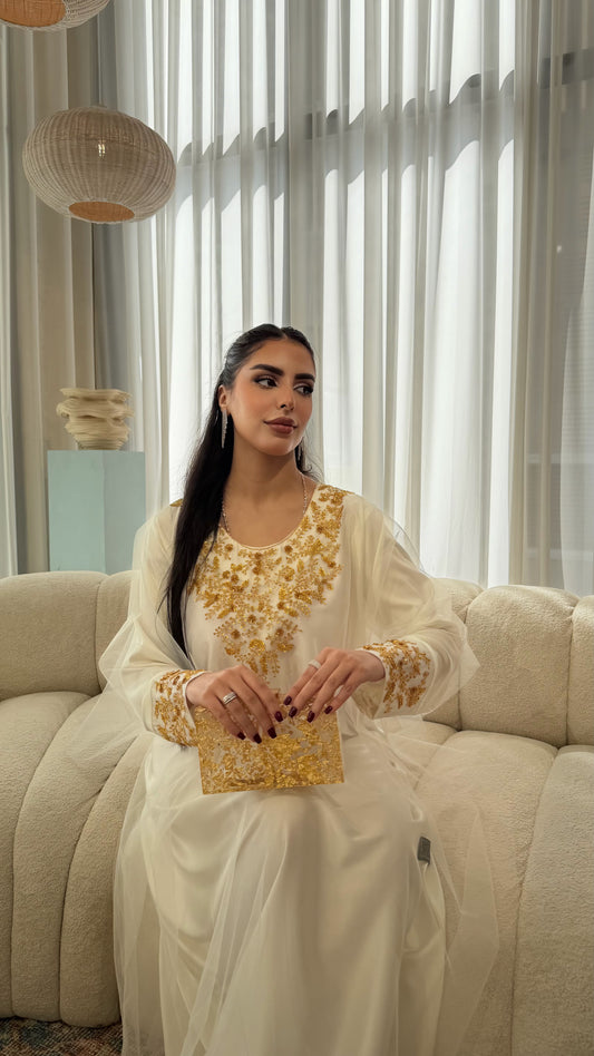 Radiate celestial charm with the Ivory Gilded Muse Jalabiya, a masterpiece designed for moments that demand a royal presence. This ensemble features a pristine off-white base, brought to life by opulent gold botanical embroidery that cascades across the bodice and cuffs. Wrapped in a whisper-light tulle overlay, the design creates a dreamlike, multidimensional effect that catches the light beautifully. Whether for a formal banquet or a festive family gathering, this jalabiya offers a perfect harmony of traditional splendor and contemporary sophistication.