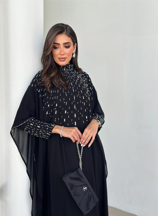 Make a striking statement with the Midnight Sparkle Embellished Dress. Designed in a flowing black silhouette, this elegant piece features delicate all-over embellishments that shimmer subtly with every movement. The high neckline and relaxed drape offer a refined, modest look, while the lightweight chiffon fabric ensures graceful flow and comfort.