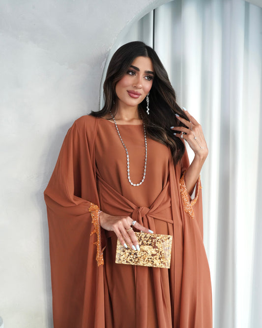 Step into refined elegance with the Amber Glow Embellished , a statement piece designed for graceful evenings and special occasions. Crafted in a warm amber-brown tone, this features a fluid silhouette that drapes effortlessly, creating a soft, flattering flow with every movement.
