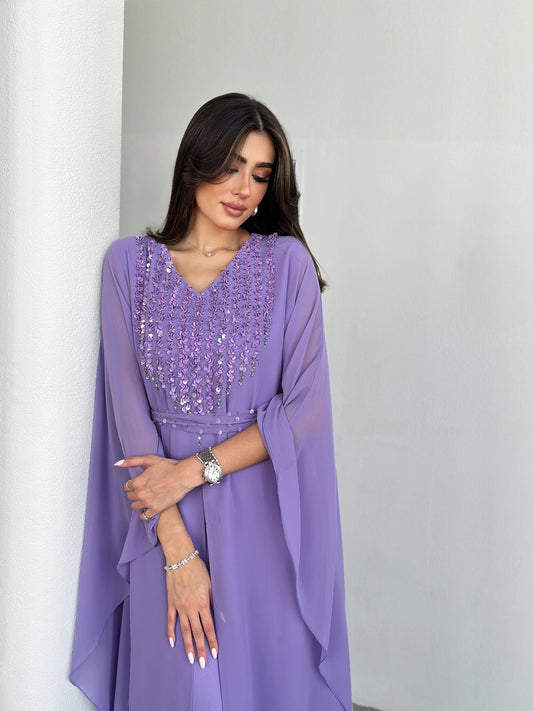Elevate your evening wardrobe with the Amethyst Lace Overlay , a refined piece designed for effortless elegance. This jalabiya features a rich purple inner dress paired with a delicate sheer lace outer layer, creating a graceful contrast of texture and depth.