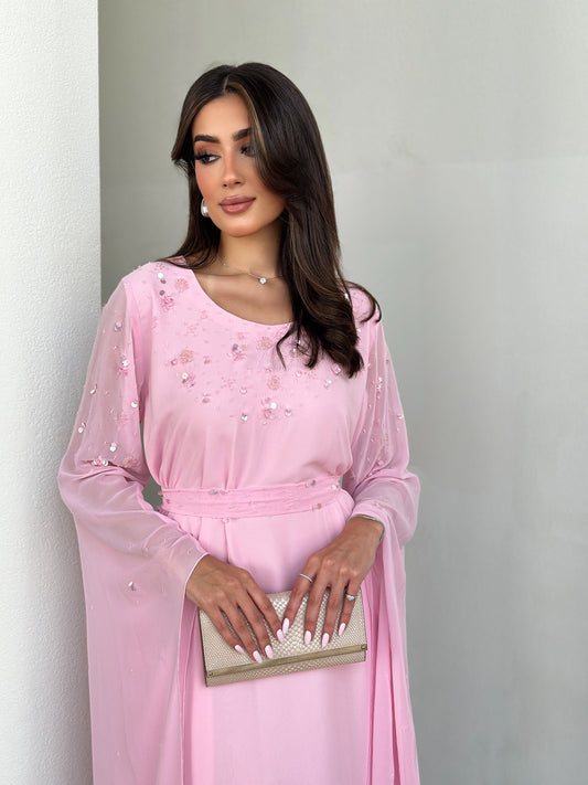 The flowing silhouette is enhanced with airy cape-style sleeves that drape gracefully, offering both coverage and sophistication. A delicate matching belt defines the waist, while the full-length design ensures a modest yet graceful look. Lightweight and fluid, this dress is perfect for evening events, celebrations, and special gatherings.
