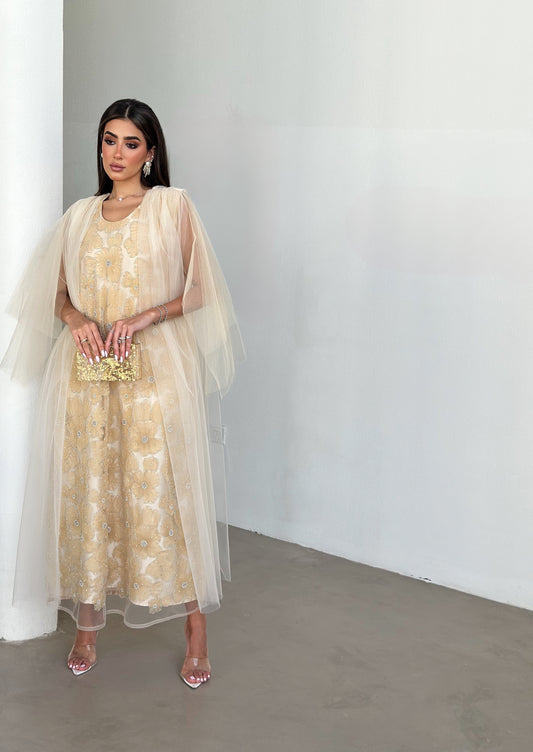 The Golden Bloom Cape Dress is a refined statement piece crafted for elegant occasions. Featuring a beautifully embroidered inner dress adorned with delicate floral motifs in soft gold tones, this design is elevated by a flowing sheer tulle cape that drapes gracefully over the shoulders.
